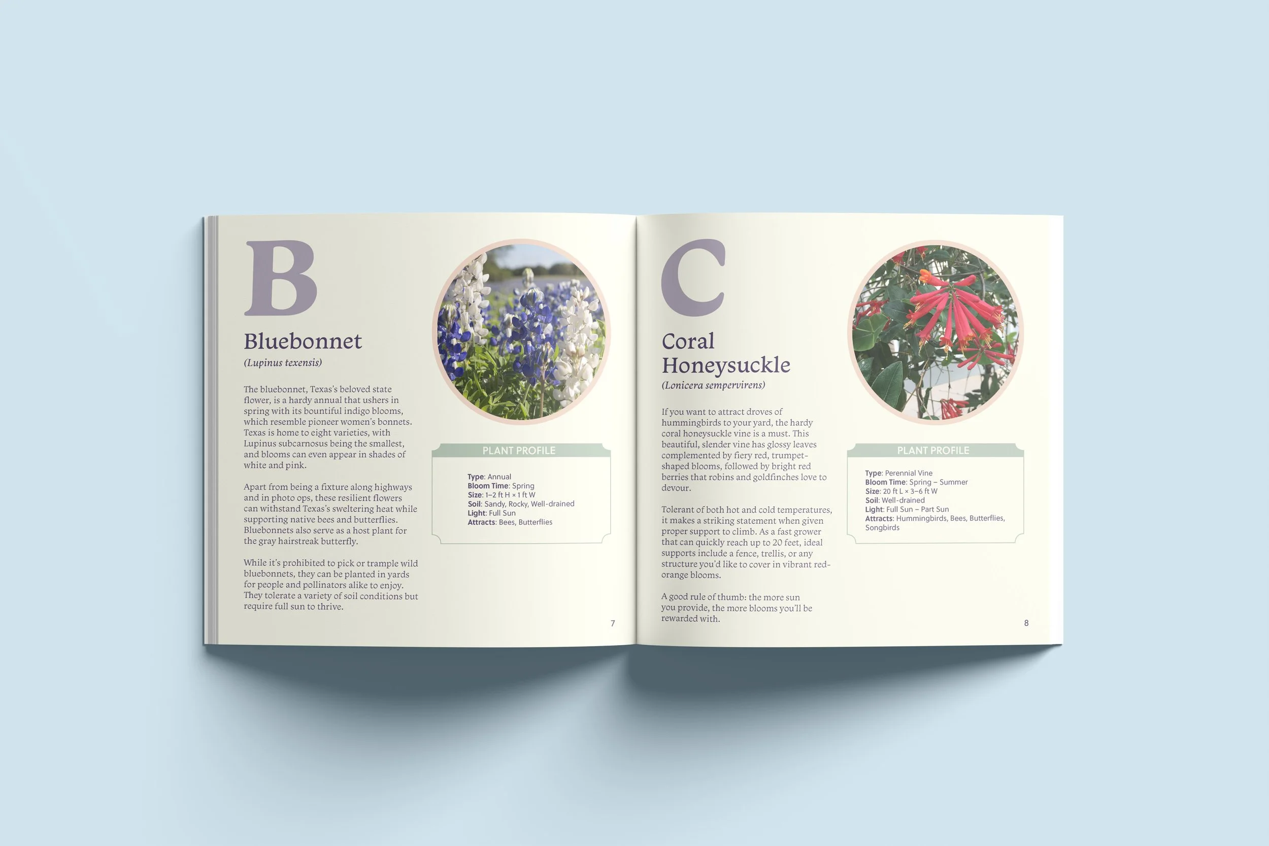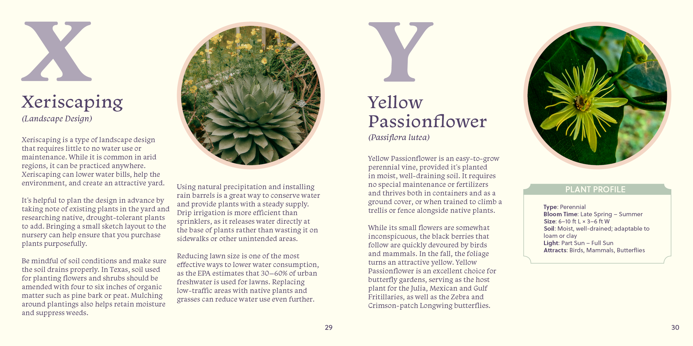 I had a lot of fun selecting the plants to include in the guide and creating a flexible system for displaying information and images of each species. At times, though, I came across plants that fit letters I had already used and struggled to find solid options for others. For example, I had to do some problem solving and created a page about xeriscaping when I couldn’t find a relevant native plant for “X,” all while keeping the information relevant to the guide.